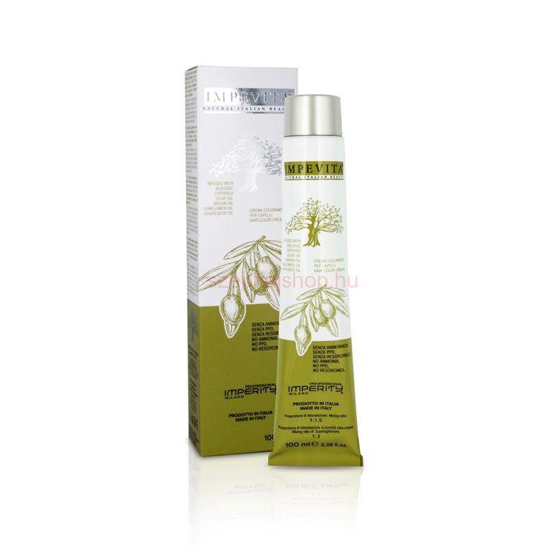 Impevita Ammónia- és PPD Mentes Krémhajfesték 100ml Az Impevita kímélő krémhajfesték garantálja az ősz hajszálak akár 100%-os fedését és a természetes hajszín négy árnyalatú felvilágosítását, A gondosan kiválasztott 4 féle bio olaj: olíva-, argán-, napraforgó-, és szőlőmagolaj egyedi kombinációja biztosítja a természet által nyújtott ápoló, védő hatást a haj számára.