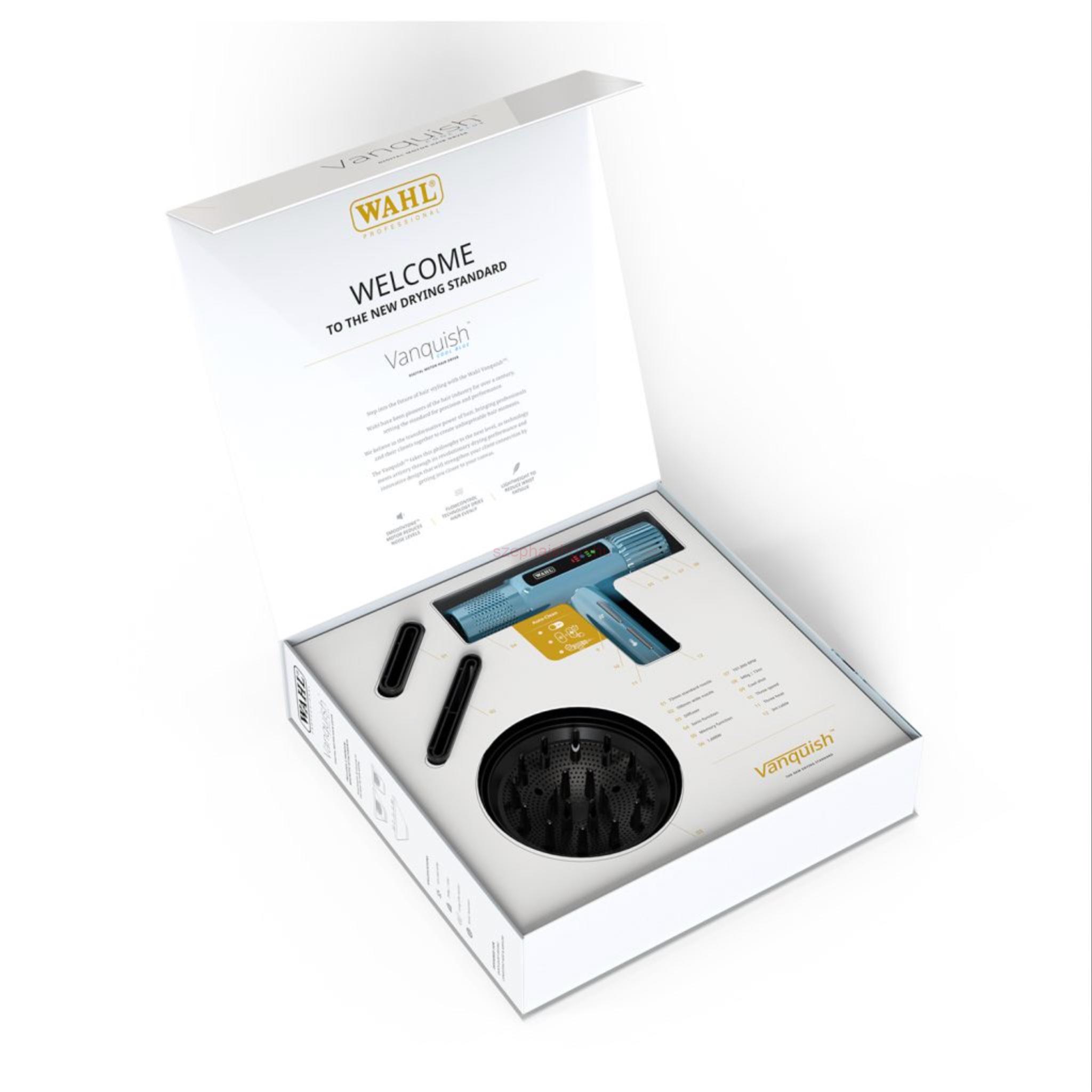 A Wahl Vanquish™ Hair Dryer Cool Blue egy prémium kategóriás hajszárító, amely modern technológiával, ergonomikus kialakítással és kiemelkedő teljesítménnyel támogatja a professzionális és otthoni hajformázást.