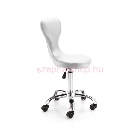 Forgózsámoly magasított hátrésszel fehér műbőr kárpittal, króm csillag talppal. Tökéletesen kiegészíti a szalon berendezését, vágáskor is használható, vagy csak a recepciós pultnál ülve; a szék kiválóan segíti a professzionális munkát a fodrászszalonokban és a szépségközpontokban egyaránt. Elegáns, ergonomikus és tartós – ideális választás forgalmas szalonokba.